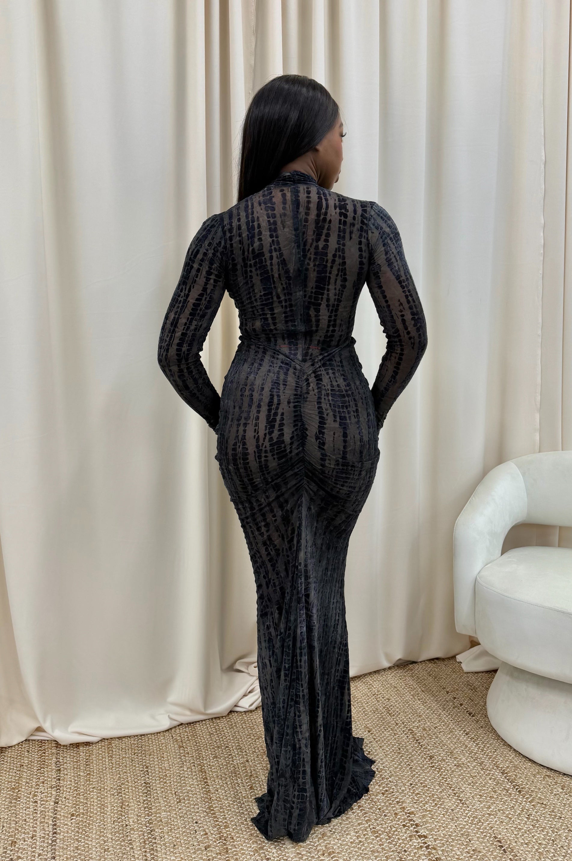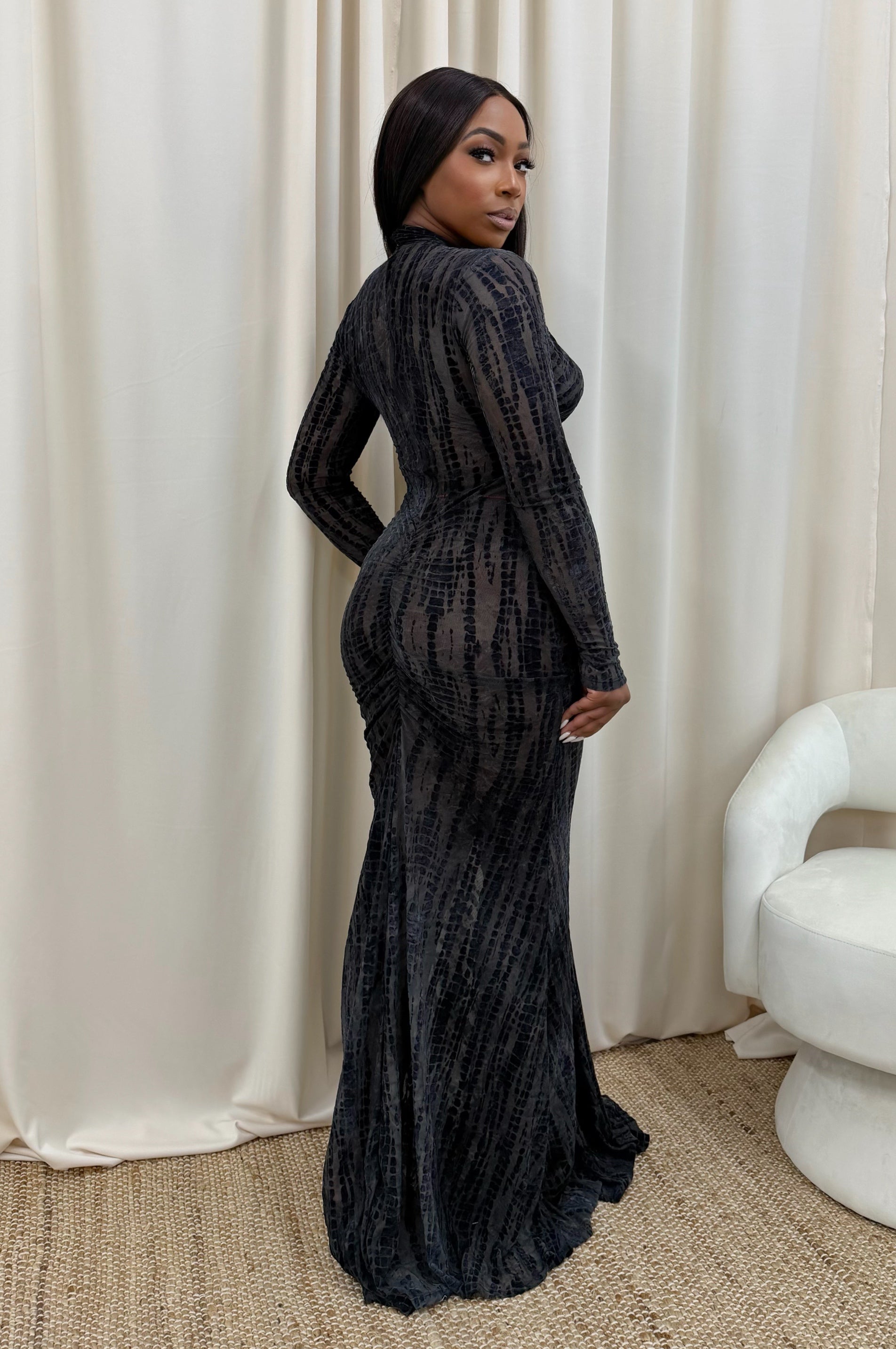 Own the night in this sleek, curve-hugging gown designed to turn heads. The twisted neckline with a sultry keyhole cutout and ruched detailing sculpts and flatters your silhouette, while long sleeves add a polished edge. Made from luxe stretch fabric for a smooth, comfortable fit—perfect for formal events and elevated nights out.