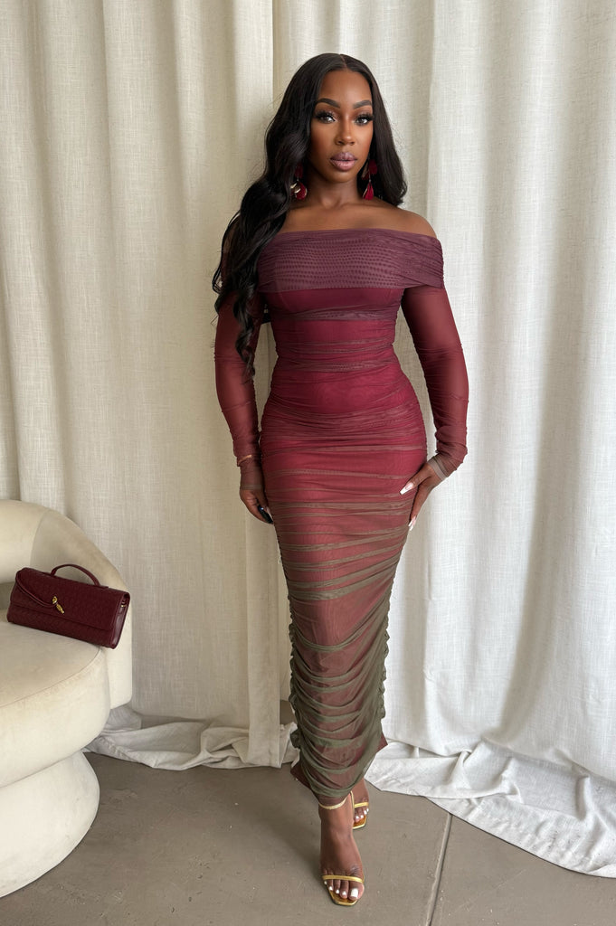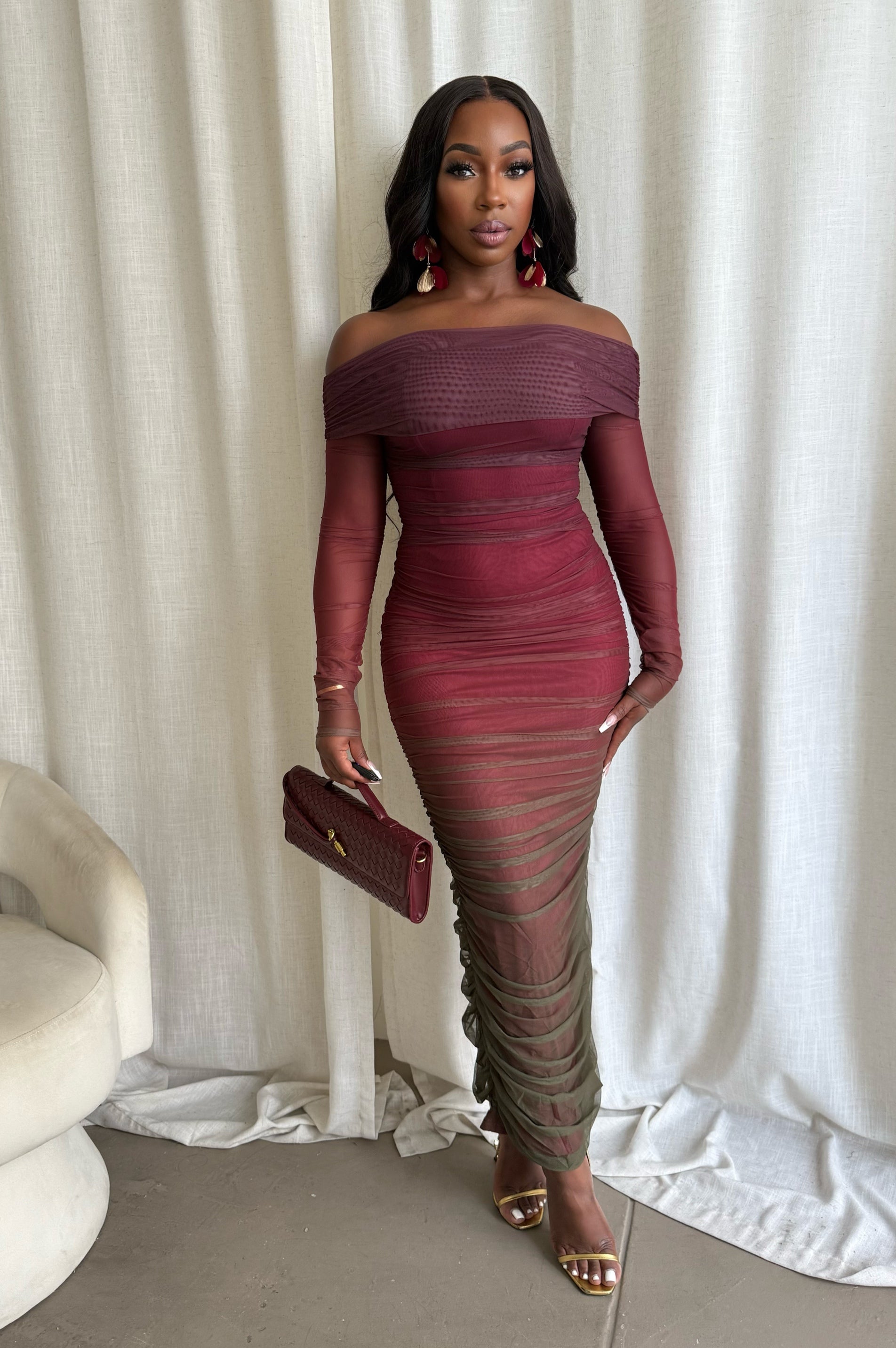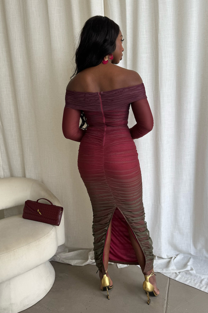 Turn heads in this off-shoulder mesh dress featuring a gradient ombre design, ruched detailing, and a figure-hugging silhouette. Elegant, sleek, and perfect for any evening event.
