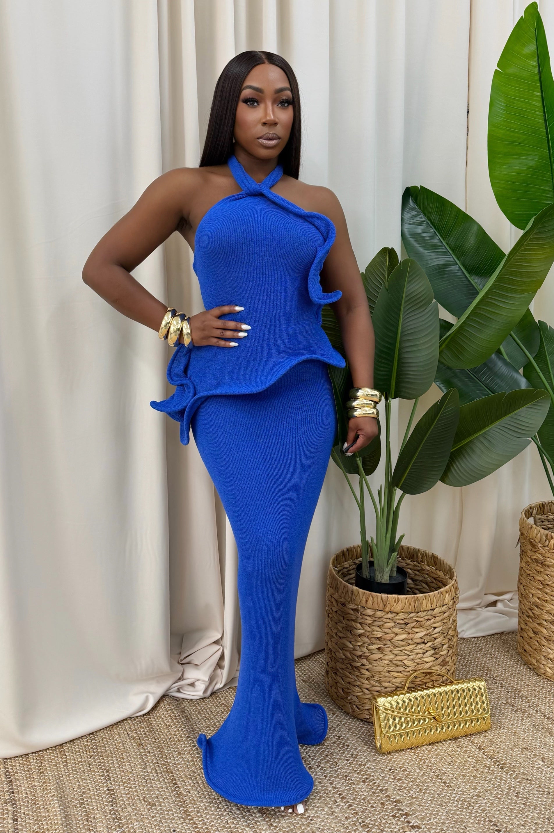 Turn heads in this stunning cobalt blue halter gown designed to sculpt and flatter your curves. The sleek body-contouring fit, elegant neckline, and sculptural waist draping create a polished, modern silhouette, while the subtle side slit adds just the right touch of allure. Crafted from stretch-knit fabric for comfort and movement—perfect for formal events and special nights out.