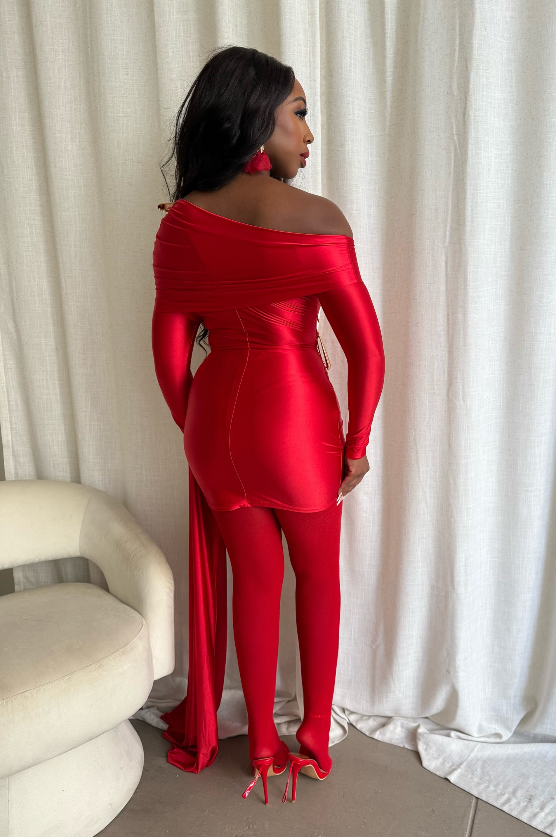 Make a bold statement in the Draped in Luxury Mini Dress. Crafted from luxe stretch satin, it features an off-shoulder neckline, figure-hugging ruching, and a dramatic side sash for added flair. Gold details add a touch of elegance.