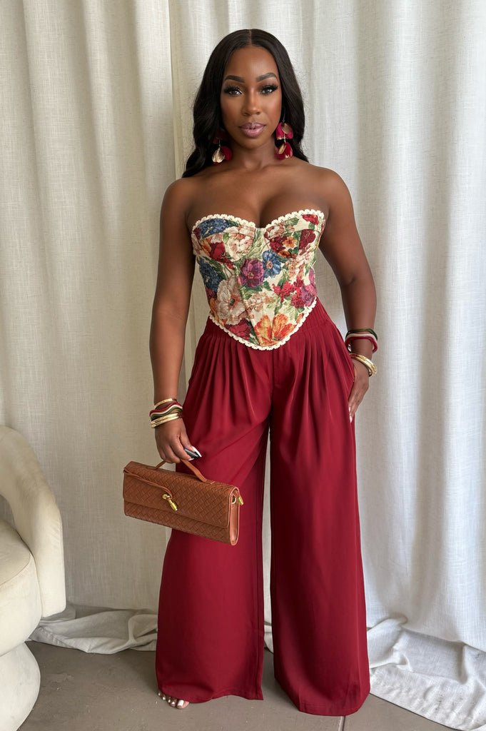 A romantic corset top featuring a vintage floral print, lace trim, and a sculpted fit that flatters the waist. Perfect for pairing with trousers or skirts.