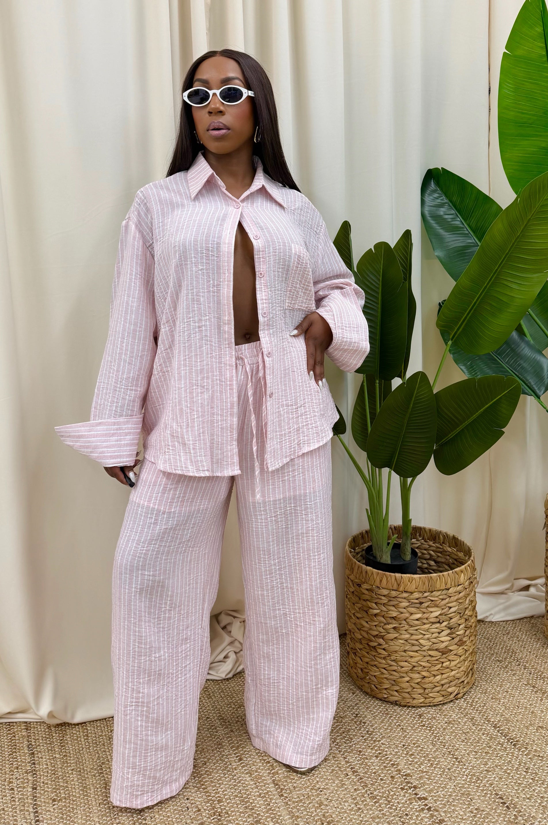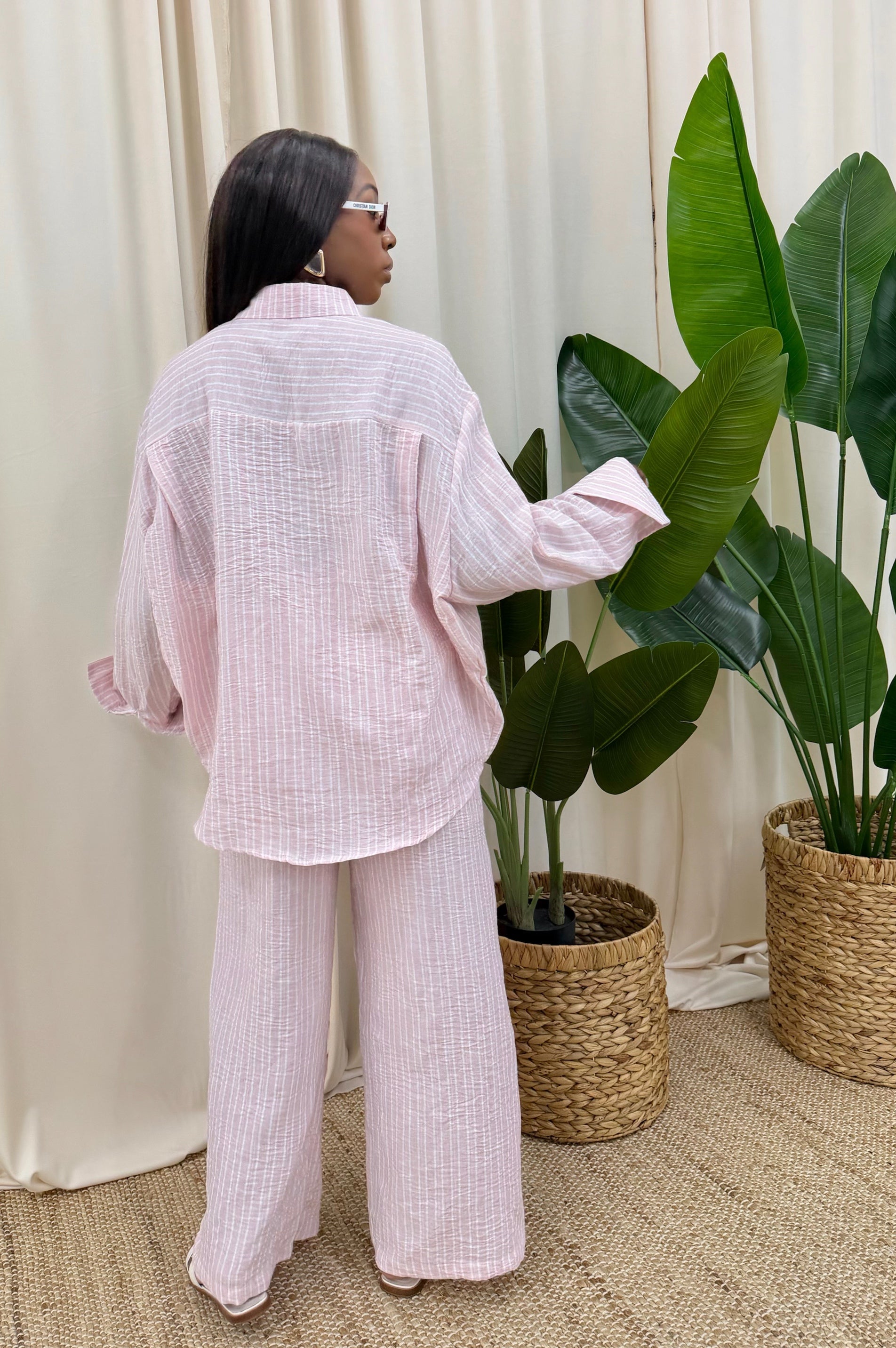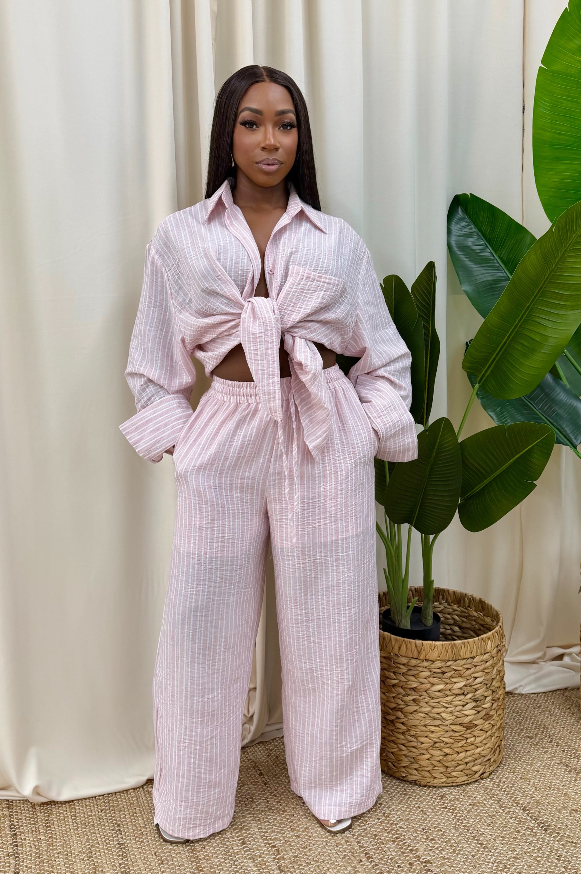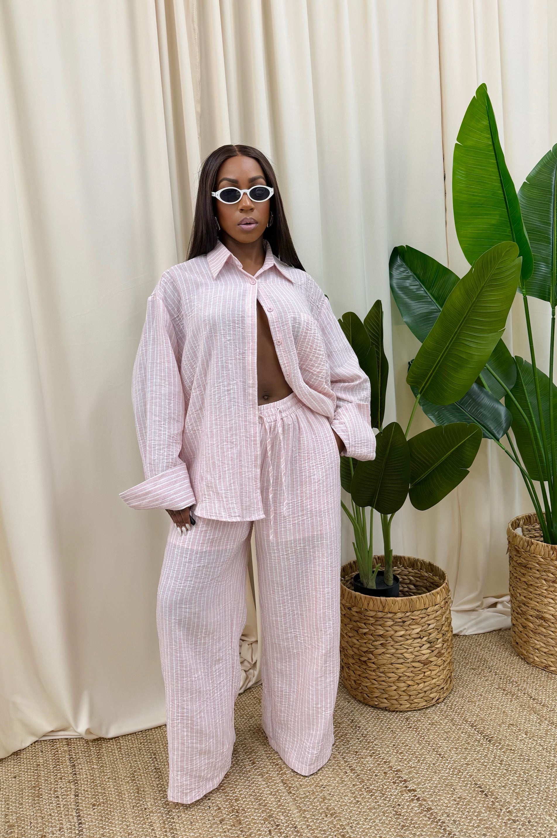 Effortlessly cool and easy to style, this lightweight pants set features an oversized button-down top and relaxed wide-leg pants for a breezy, laid-back look. The soft textured fabric and adjustable drawstring waist provide all-day comfort with a polished finish—perfect for brunch, vacations, and chic off-duty days.