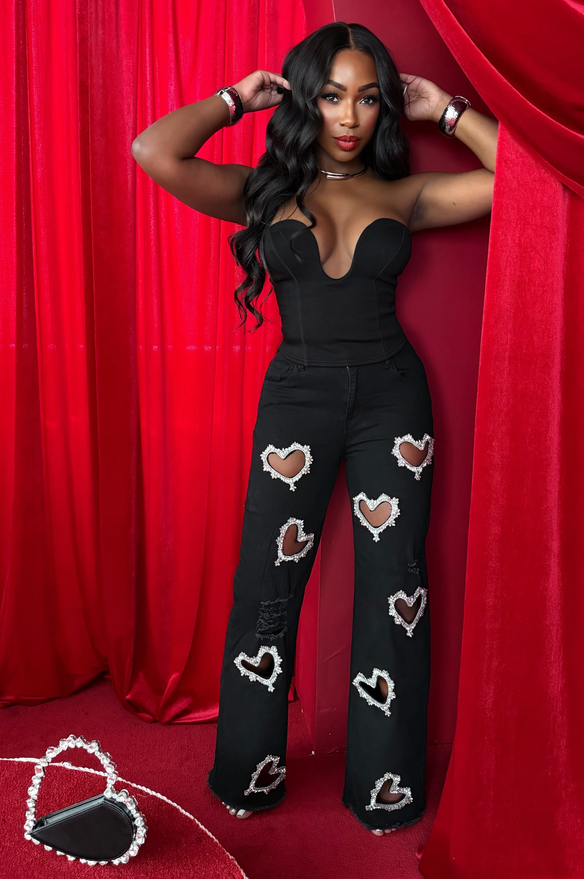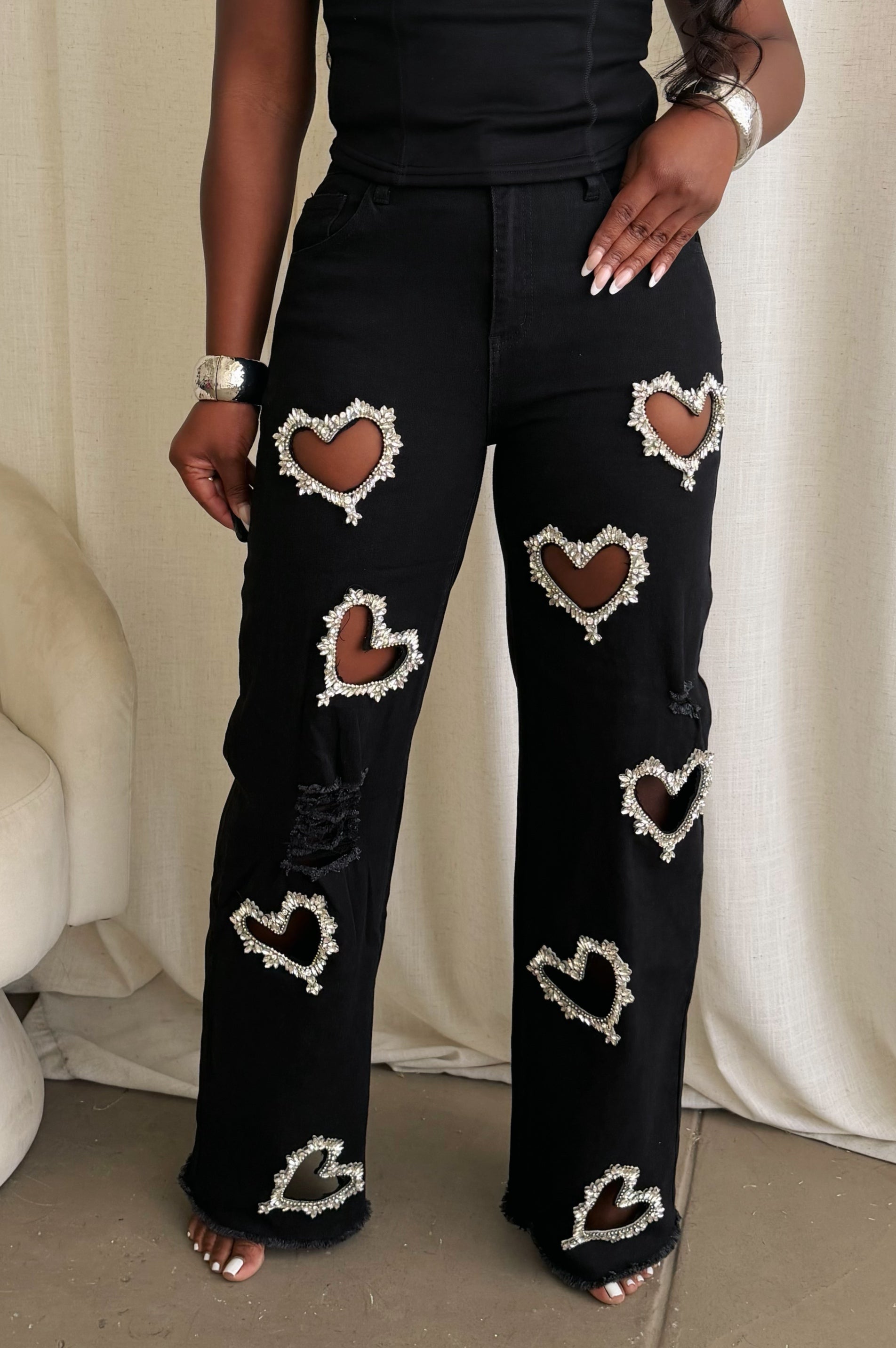Sleek black denim jeans featuring bold heart-shaped cutouts trimmed with sparkling rhinestones. Designed with a high-waisted fit and straight-leg silhouette, these statement pants bring the perfect mix of edge and romance—made to stand out day or night.