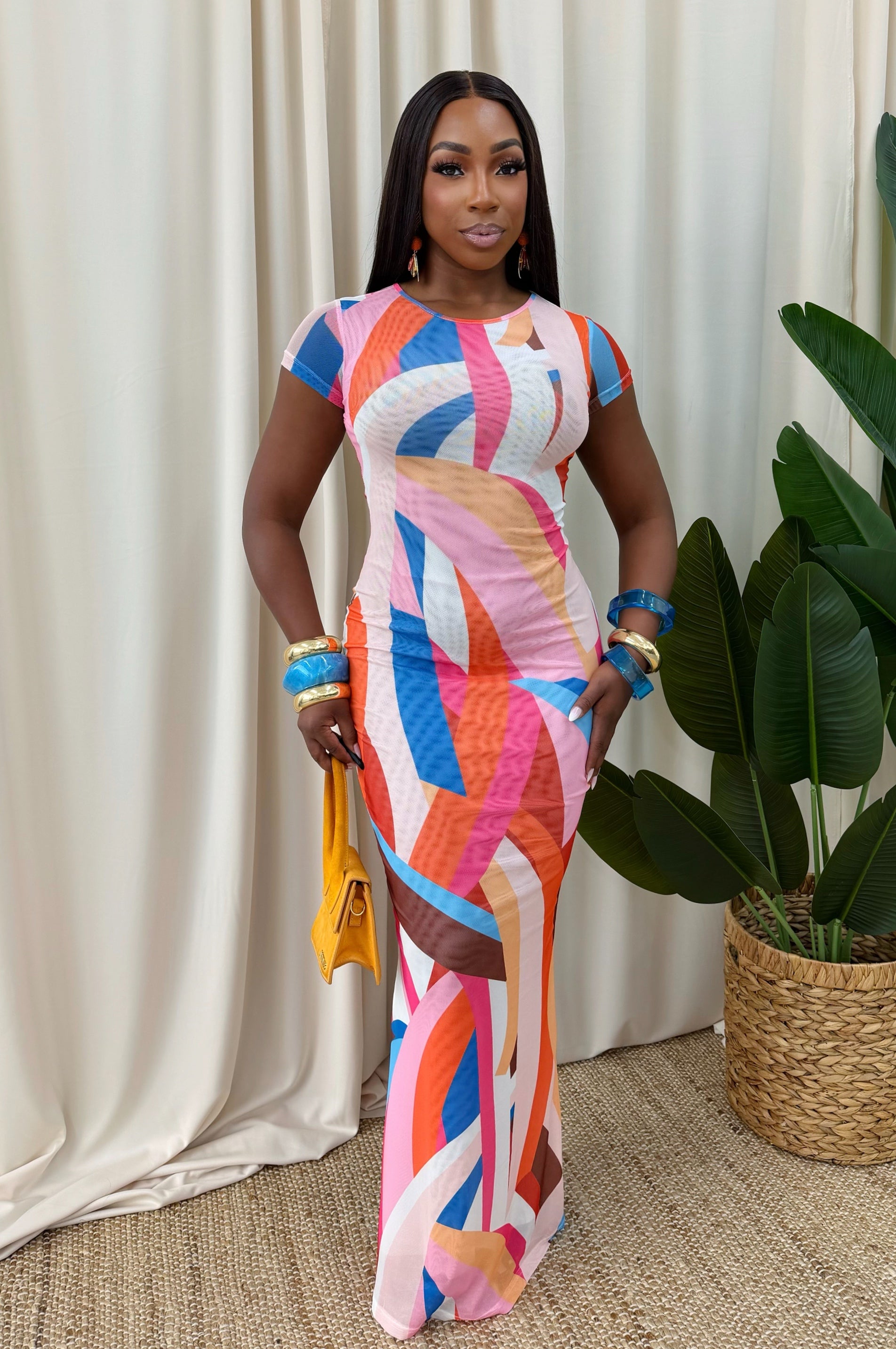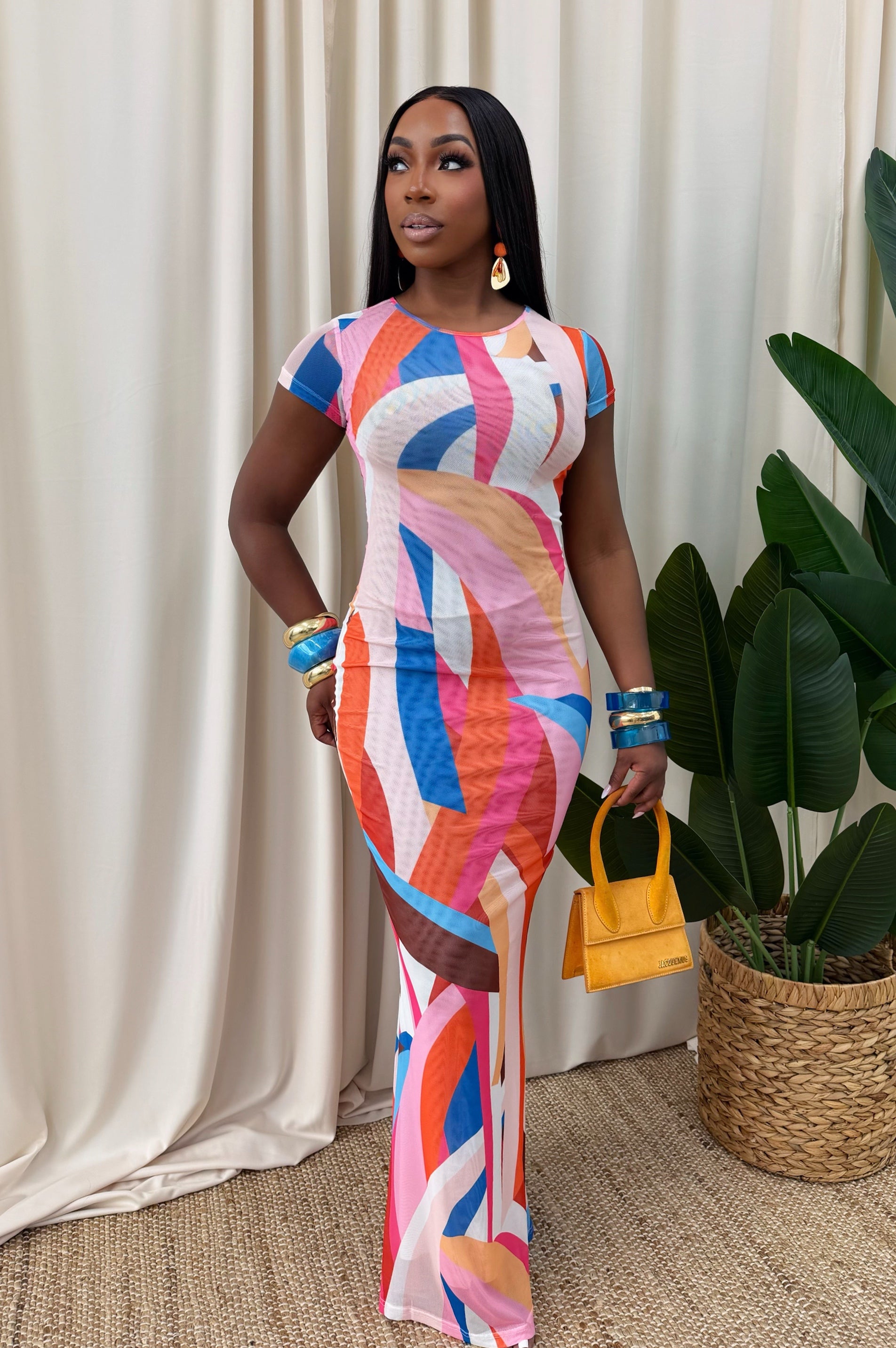 Bold and curve-hugging, this short-sleeve maxi dress features a vibrant abstract print in pink, blue, and orange tones. Crafted from stretchy double lined mesh fabric, it contours beautifully for a sleek, flattering fit — perfect for brunch, vacations, or stylish evenings out.