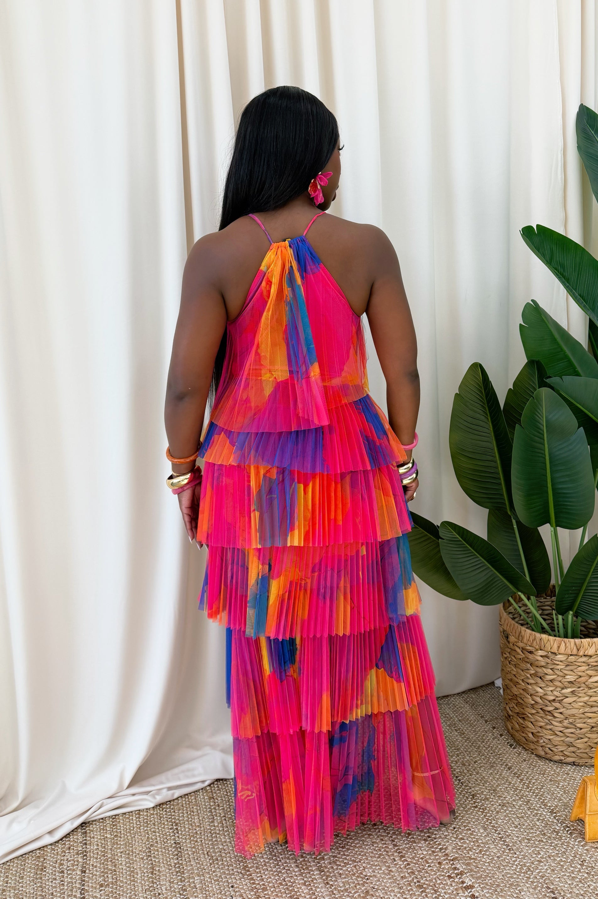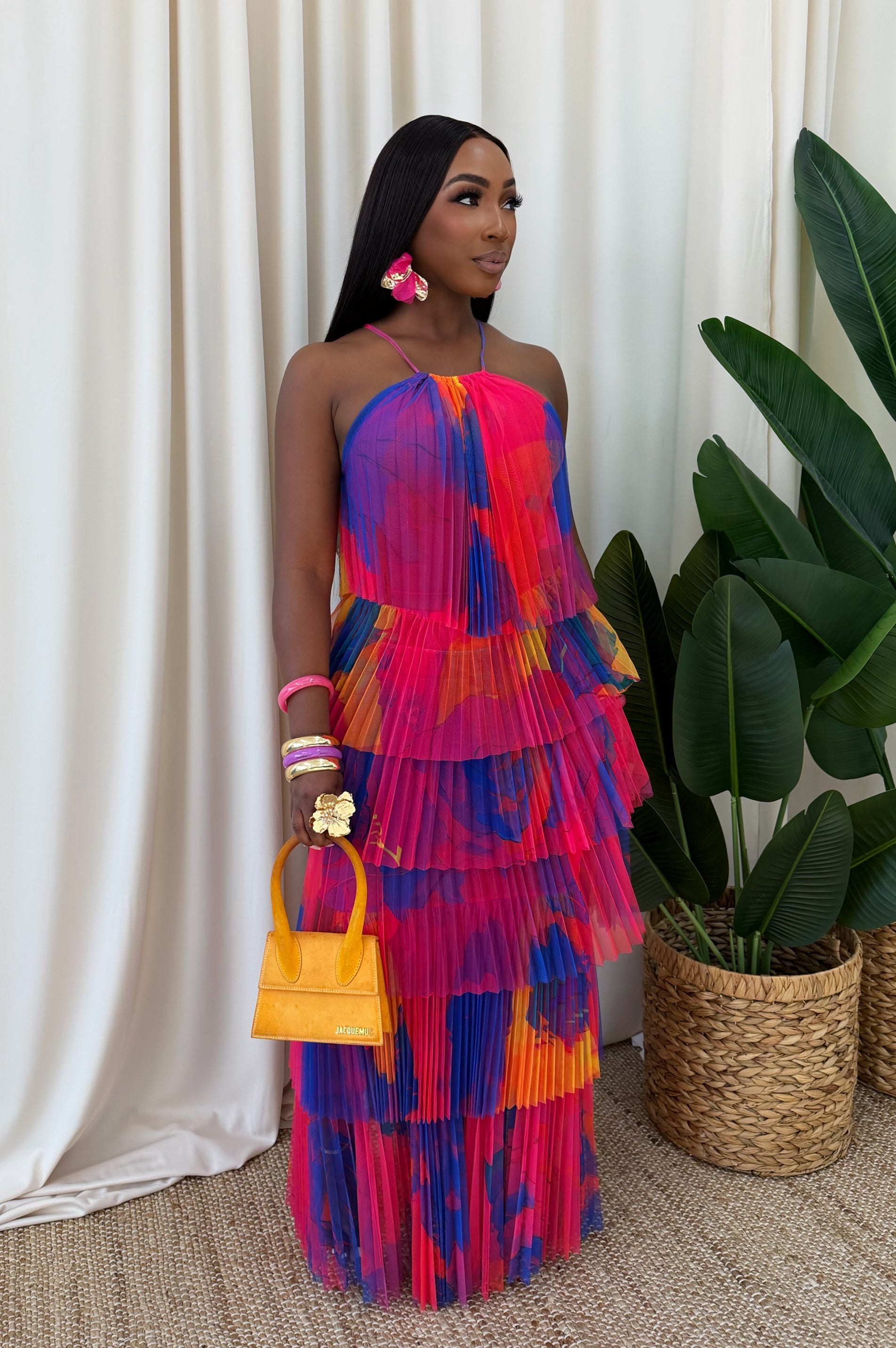 Bold and vibrant, this halter maxi dress features layered pleated detailing and a stunning blend of pink, orange, and blue hues. Lightweight and flowy, it moves beautifully with every step — perfect for vacations, special events, and statement moments.