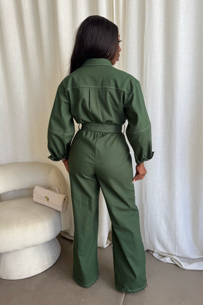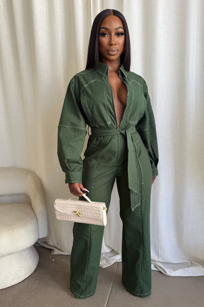 Make a bold statement in this green utility jumpsuit with contrast stitching and a zipper V-neckline. The self-tie belt cinches the waist for a flattering fit, while wide legs create an effortlessly chic silhouette. Perfect for dressing up with heels or keeping it cool with sneakers.