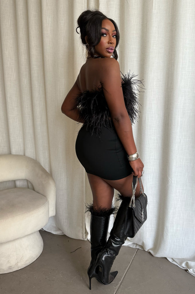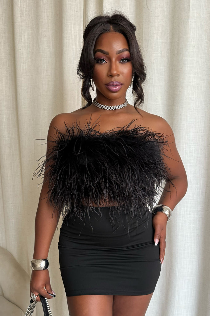 Turn heads in the Feather Fantasy Top, featuring a bold feathered front and a fitted, strapless silhouette. This statement piece adds instant drama and texture—perfect for nights out or any glam occasion.