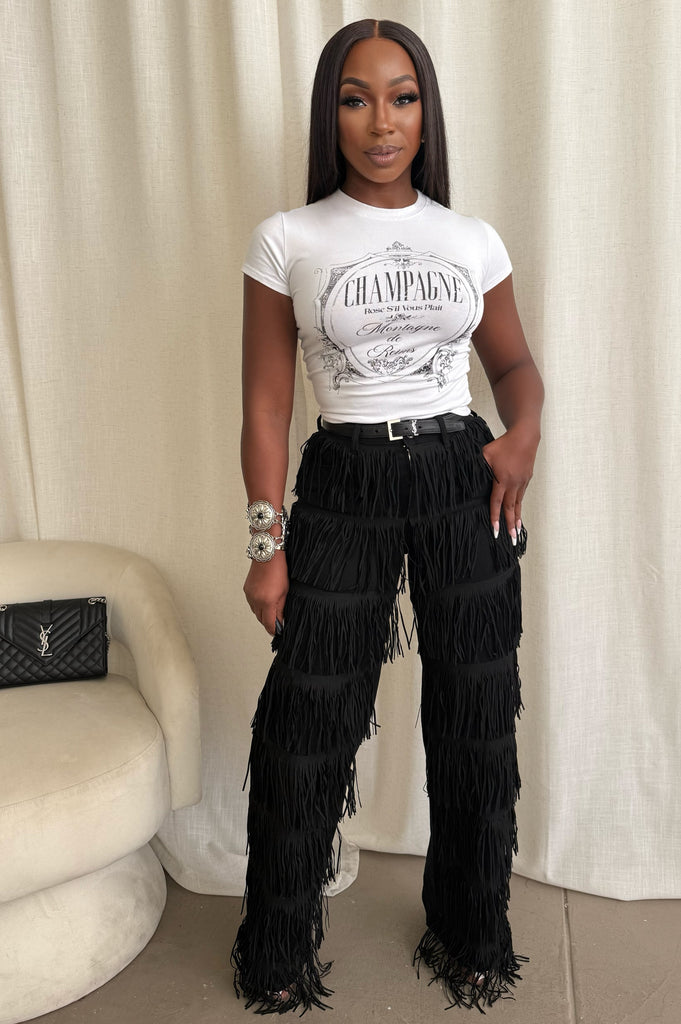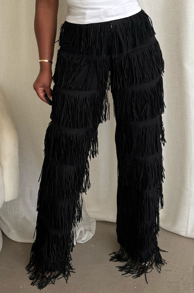 Turn heads in these statement fringe denim pants. Designed with layered suede fringe that moves with you and a flattering high-waist fit — perfect for a bold, chic look.