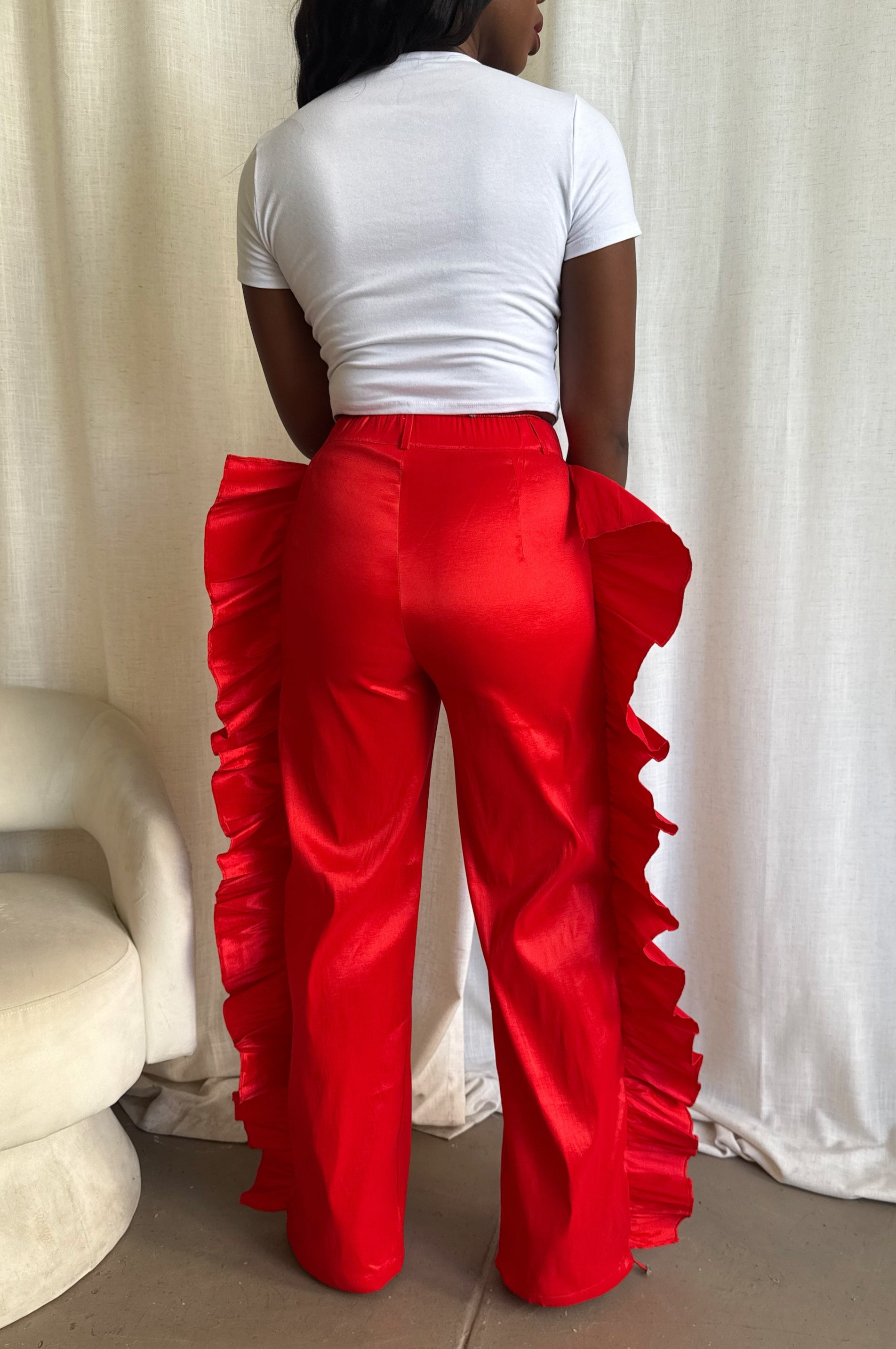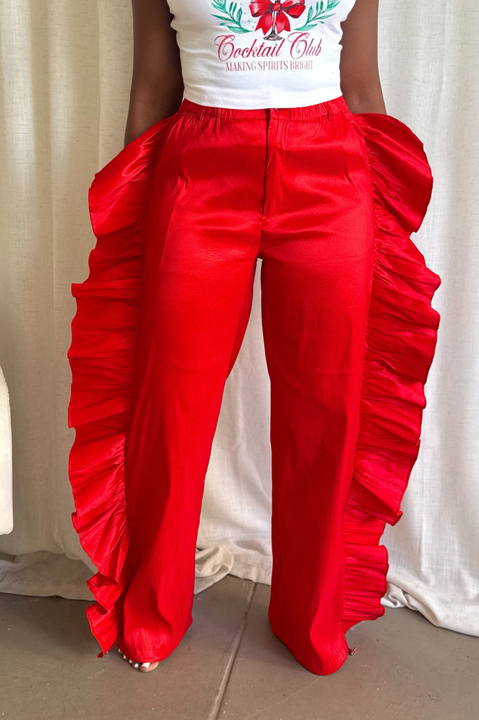 Bring the drama this season in the Holiday Flare Pants, featuring bold side ruffles that turn every step into a statement. Crafted in vibrant red satin for a sleek, festive shine—perfect for holiday parties, girls’ night, or anywhere you plan to stand out.