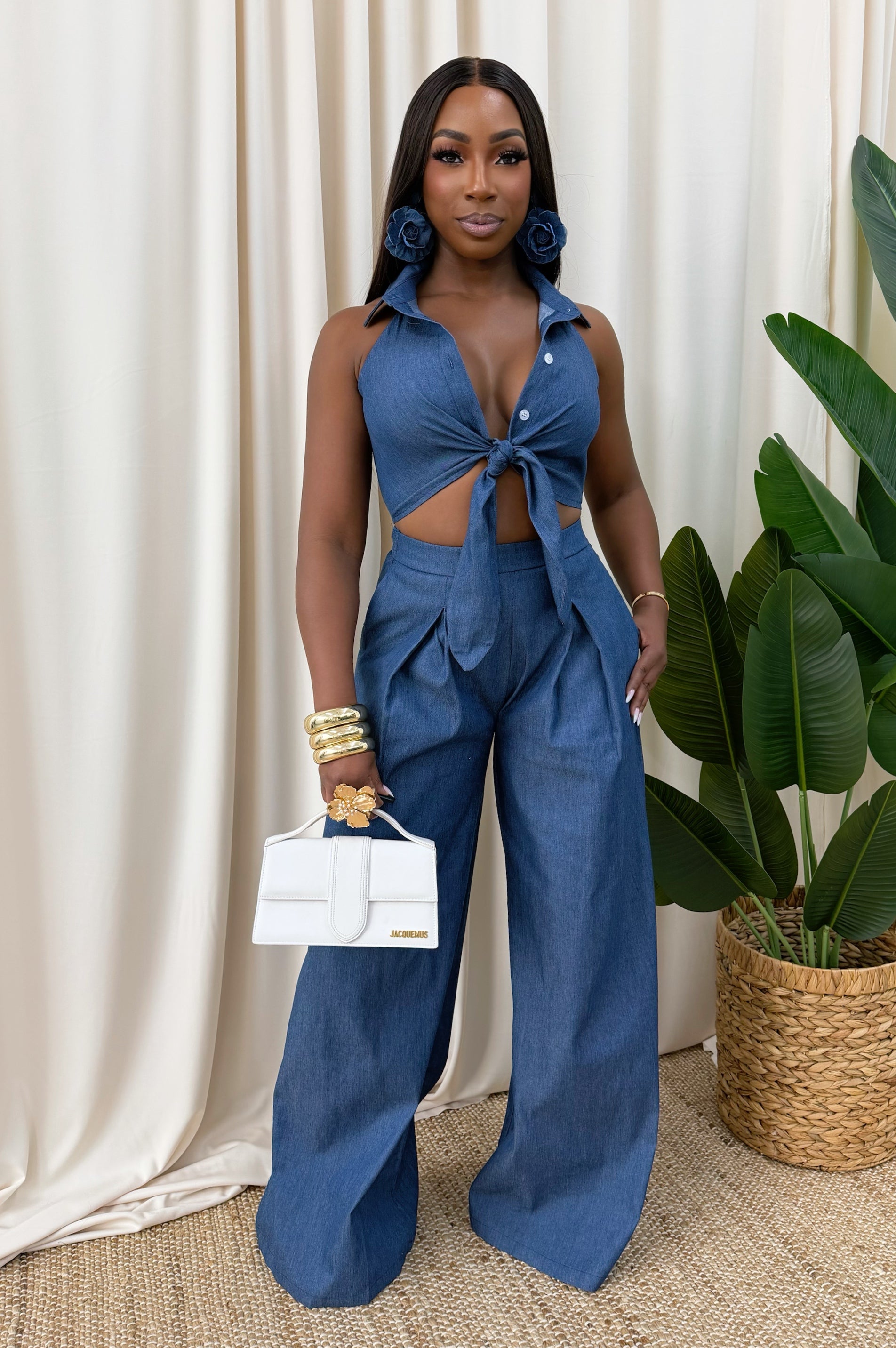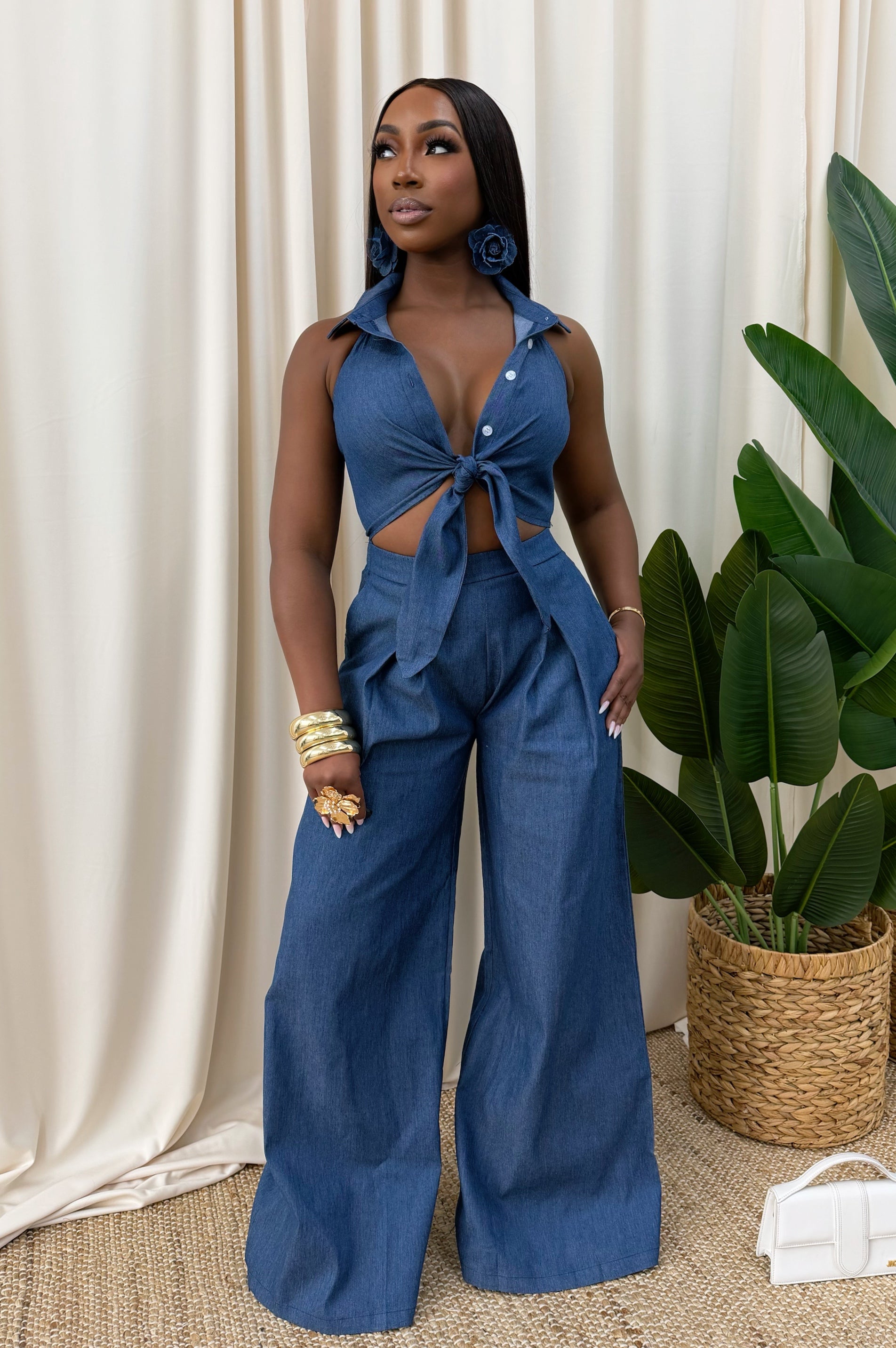 Chic with a bold edge, this denim two-piece features a sleeveless collared top with a plunging tie-front detail and high-waisted wide-leg pants for a flattering, elongated silhouette. Perfect for brunch, day parties, or stepping out in effortless style.