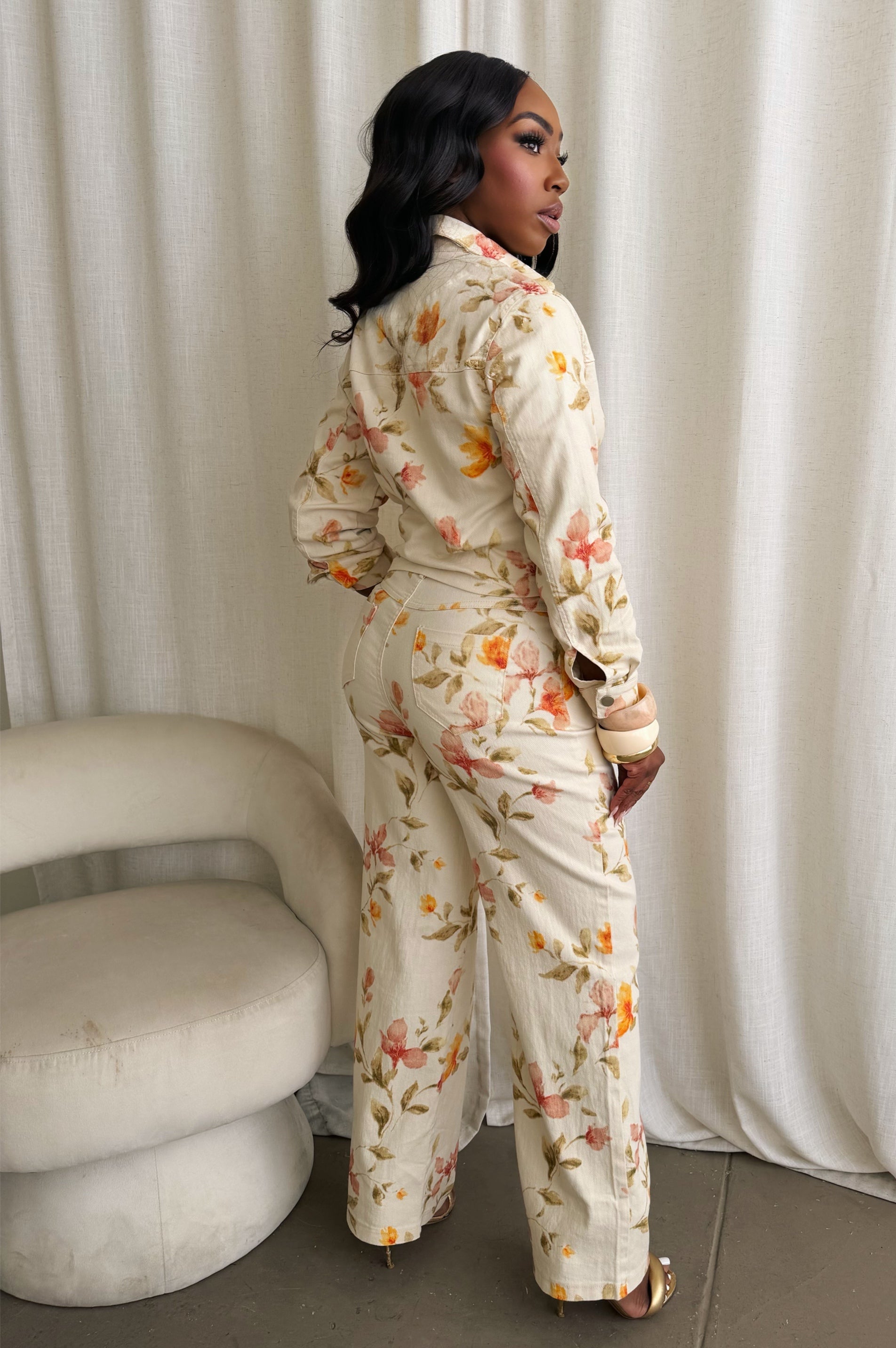 A chic denim set with a zip-front jacket finished with a soft floral print. Perfect for polished, everyday style.