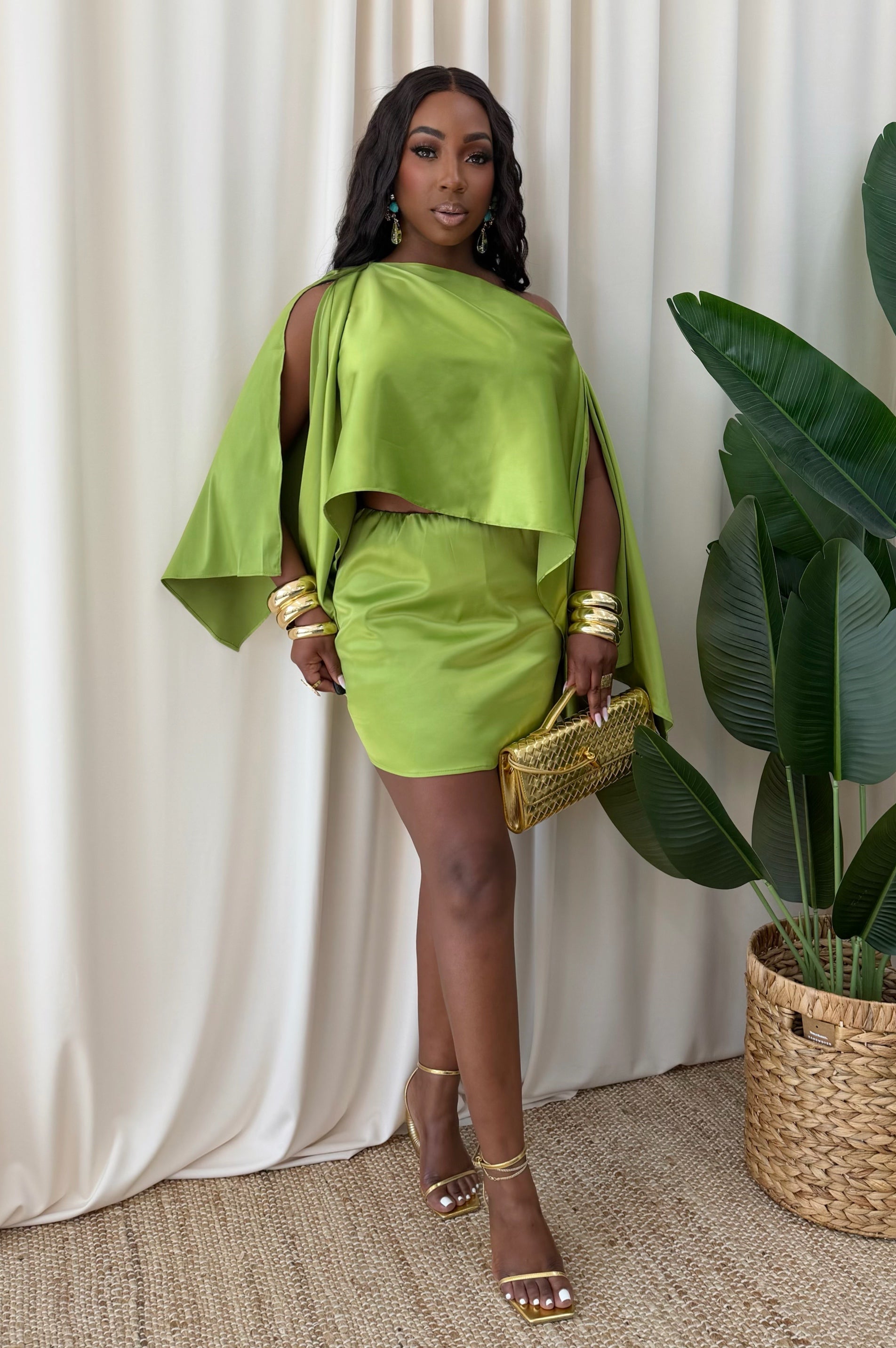 A chic two-piece featuring a draped one-shoulder top with flowy sleeves and a matching high-waisted skort. The smooth satin-like fabric gives this set an elegant, standout look—perfect for brunch, date nights, or special occasions.