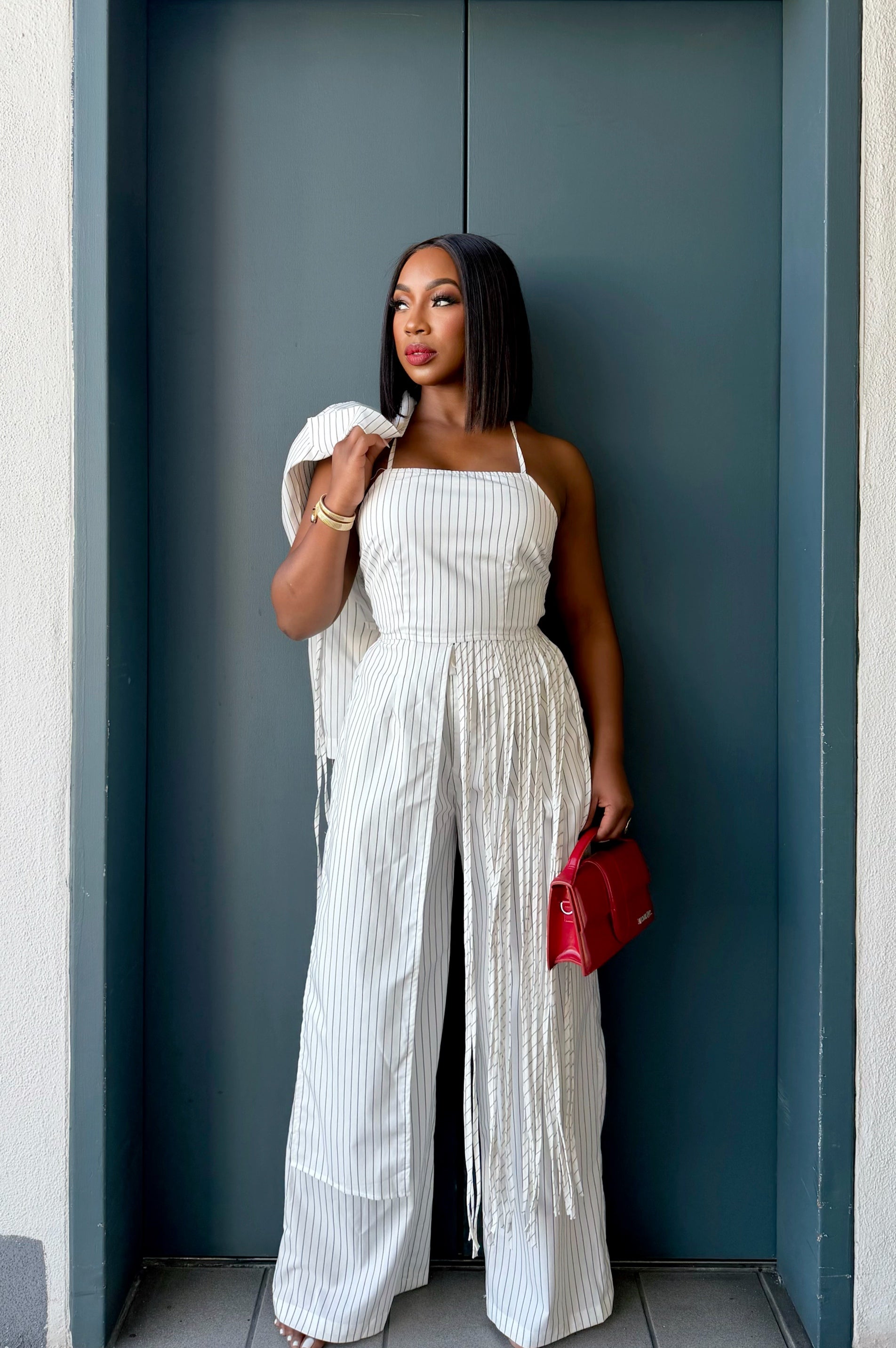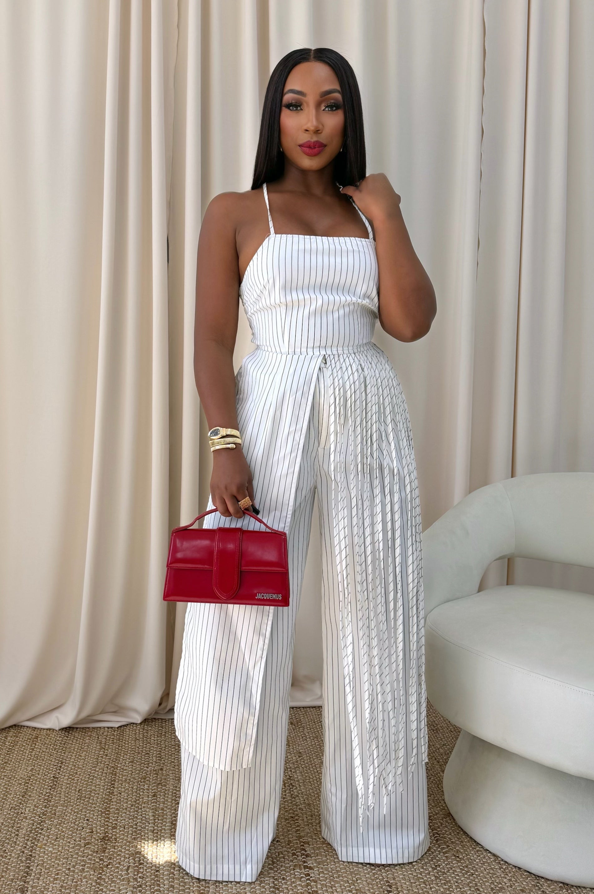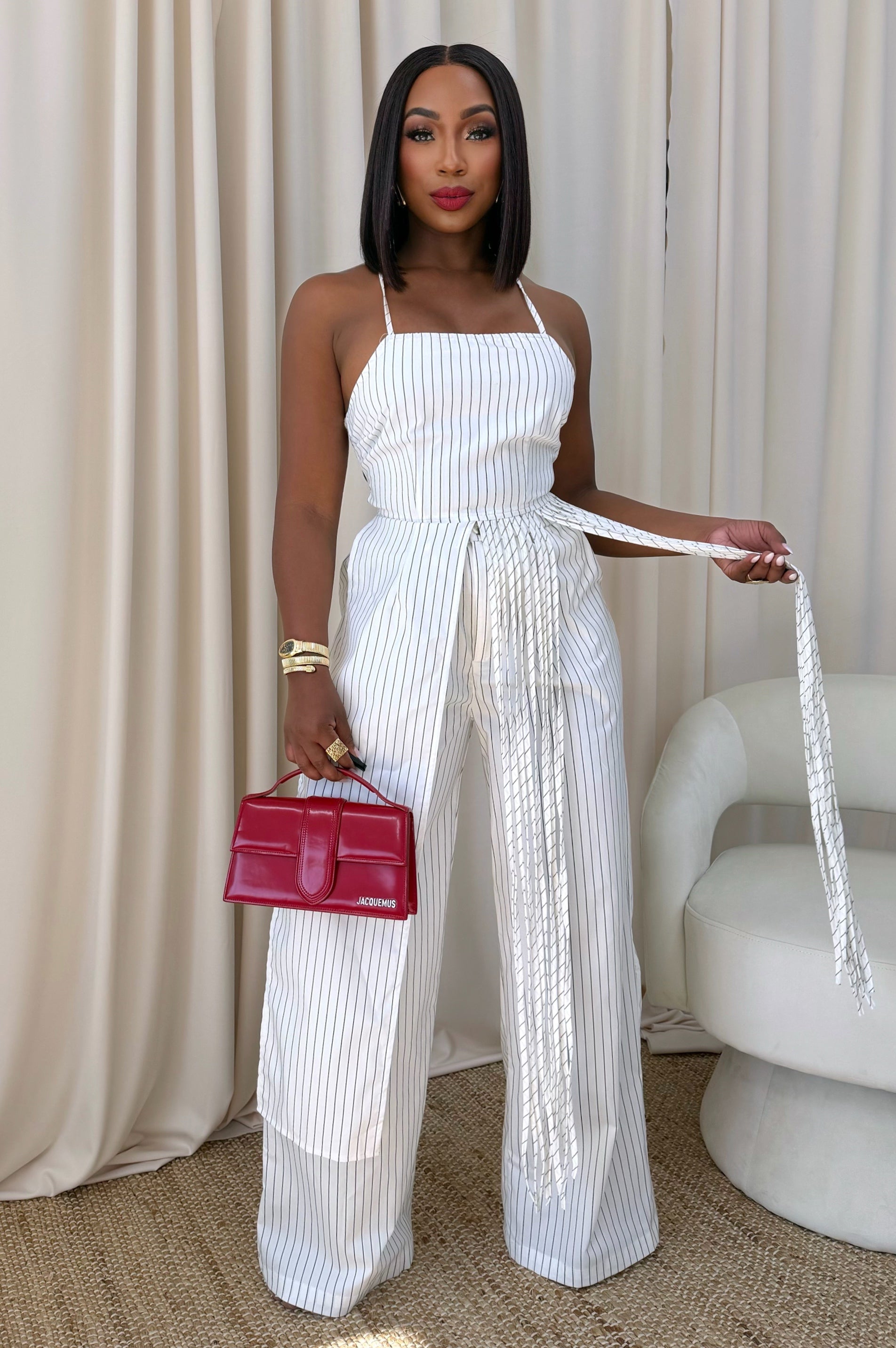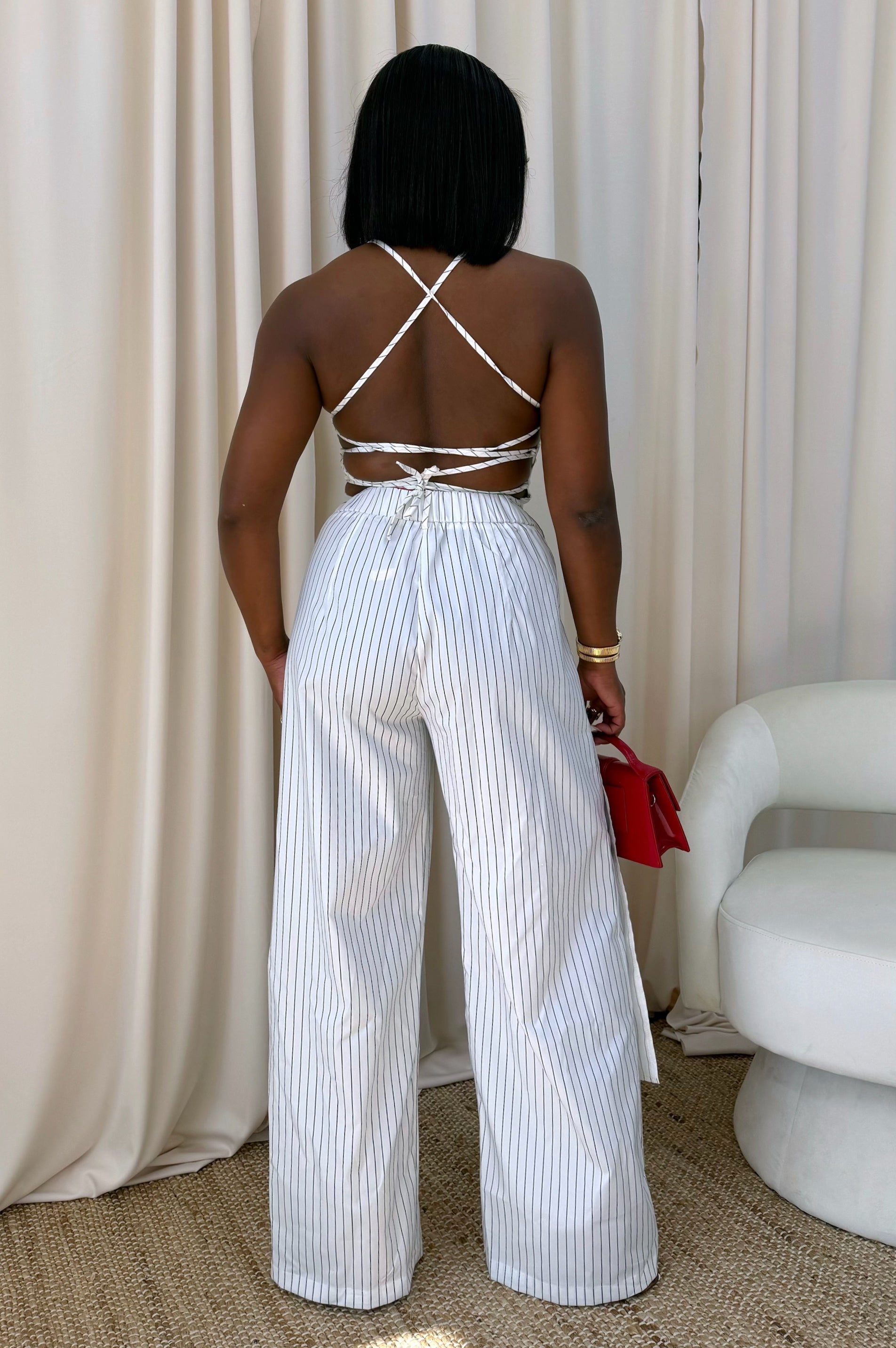 A sleek pinstripe top featuring delicate straps and an adjustable lace-up back for the perfect fit. Lightweight and flattering, it pairs effortlessly with the matching pants or your favorite denim.