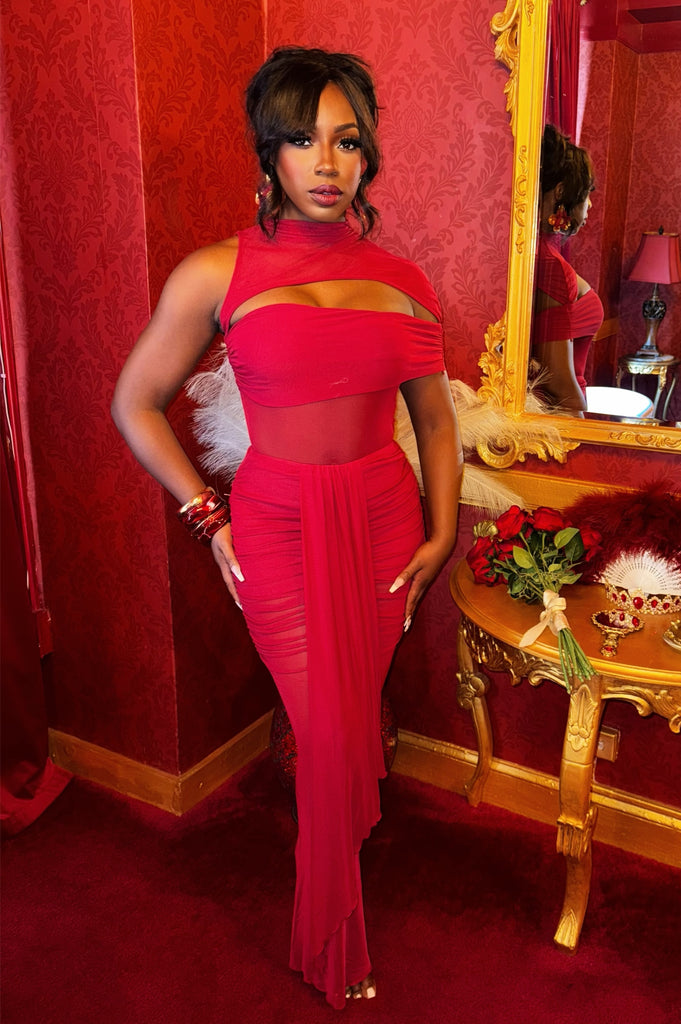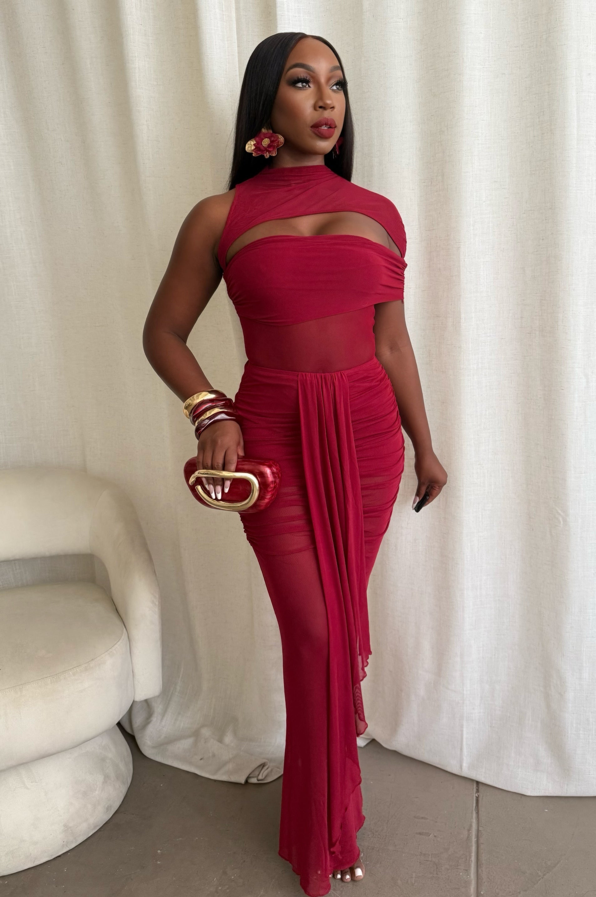 Make an entrance in this striking red set featuring a sheer one-shoulder top with bold cutouts and a ruched maxi skirt with a flowing front drape. Sleek, sultry, and unforgettable.