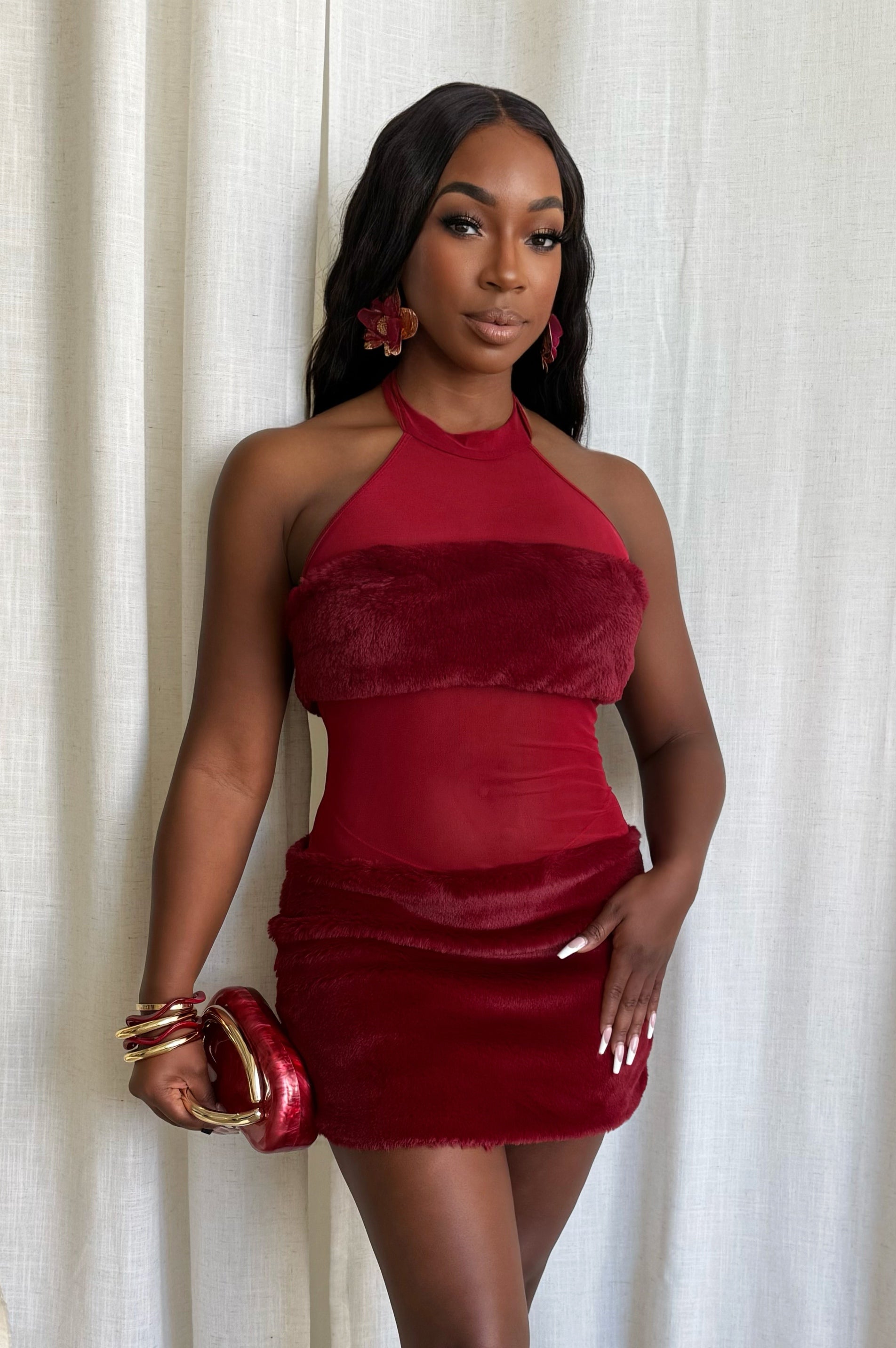 Bring the fire in this red halter mini featuring plush velvet fur panels and sheer mesh details. Bold, flirty, and perfect for a night out.