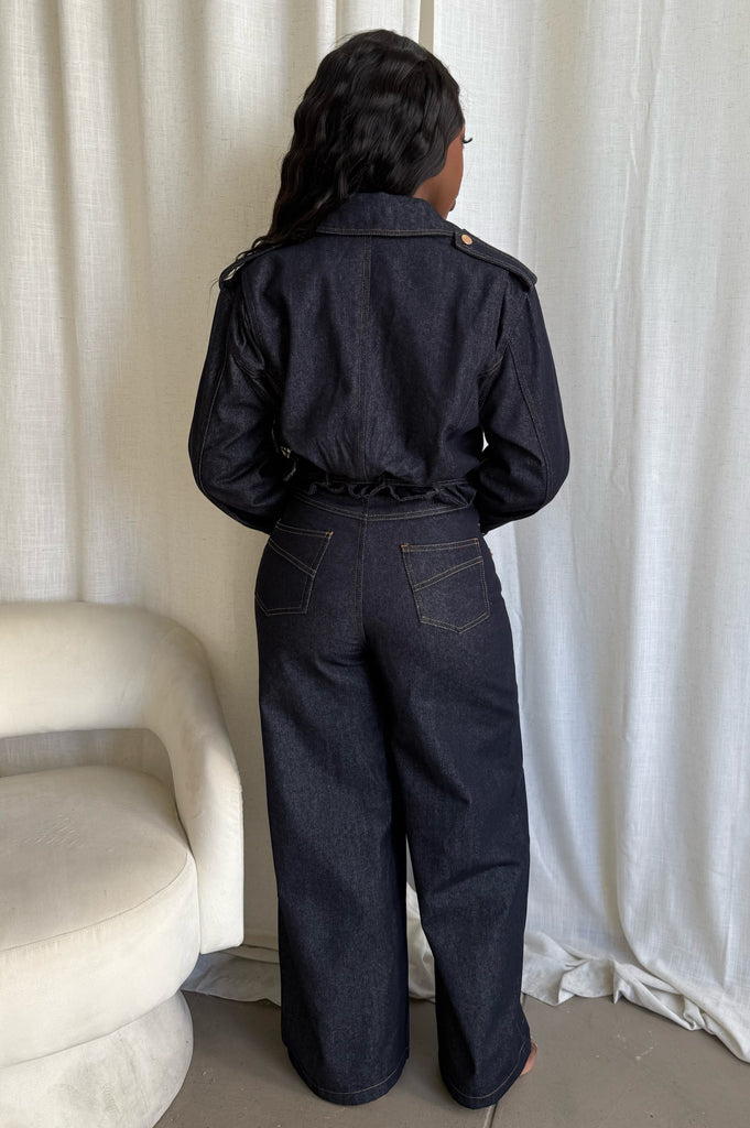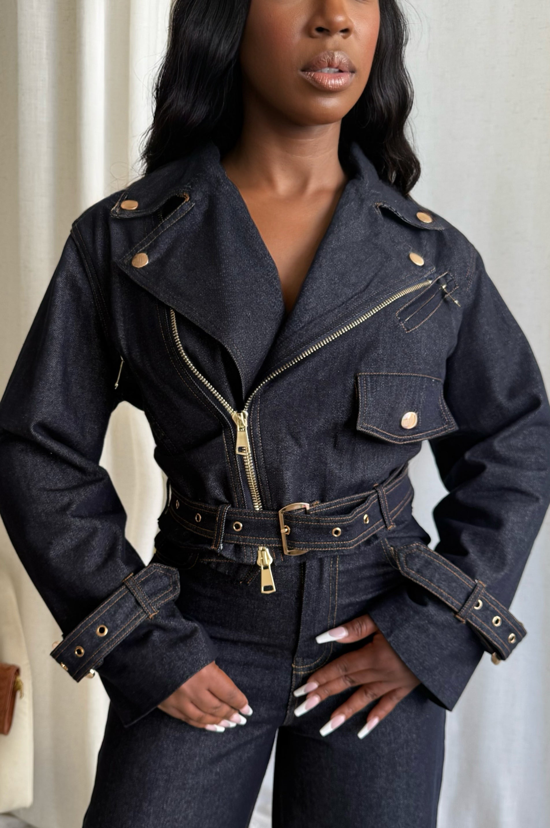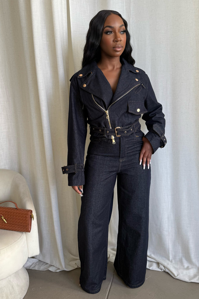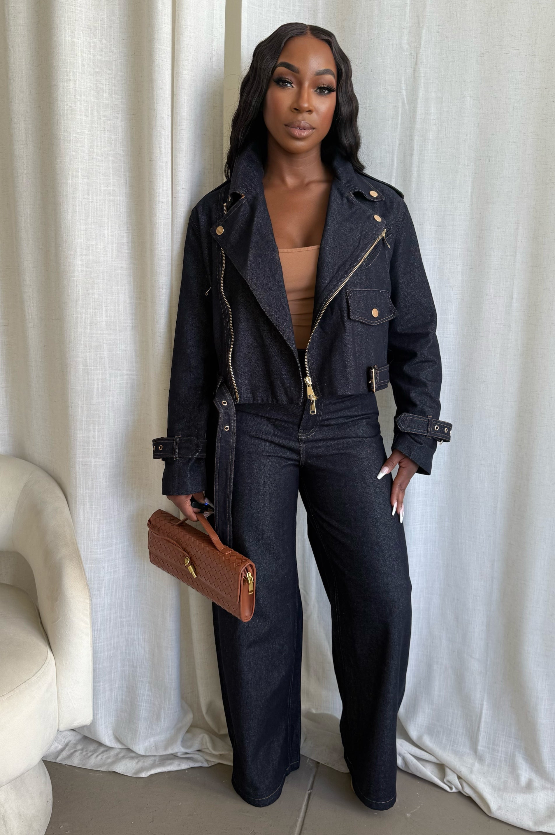 Command attention in this dark wash denim set featuring a cropped moto jacket with gold hardware and matching high-waist wide-leg pants. Effortlessly chic with an edge.