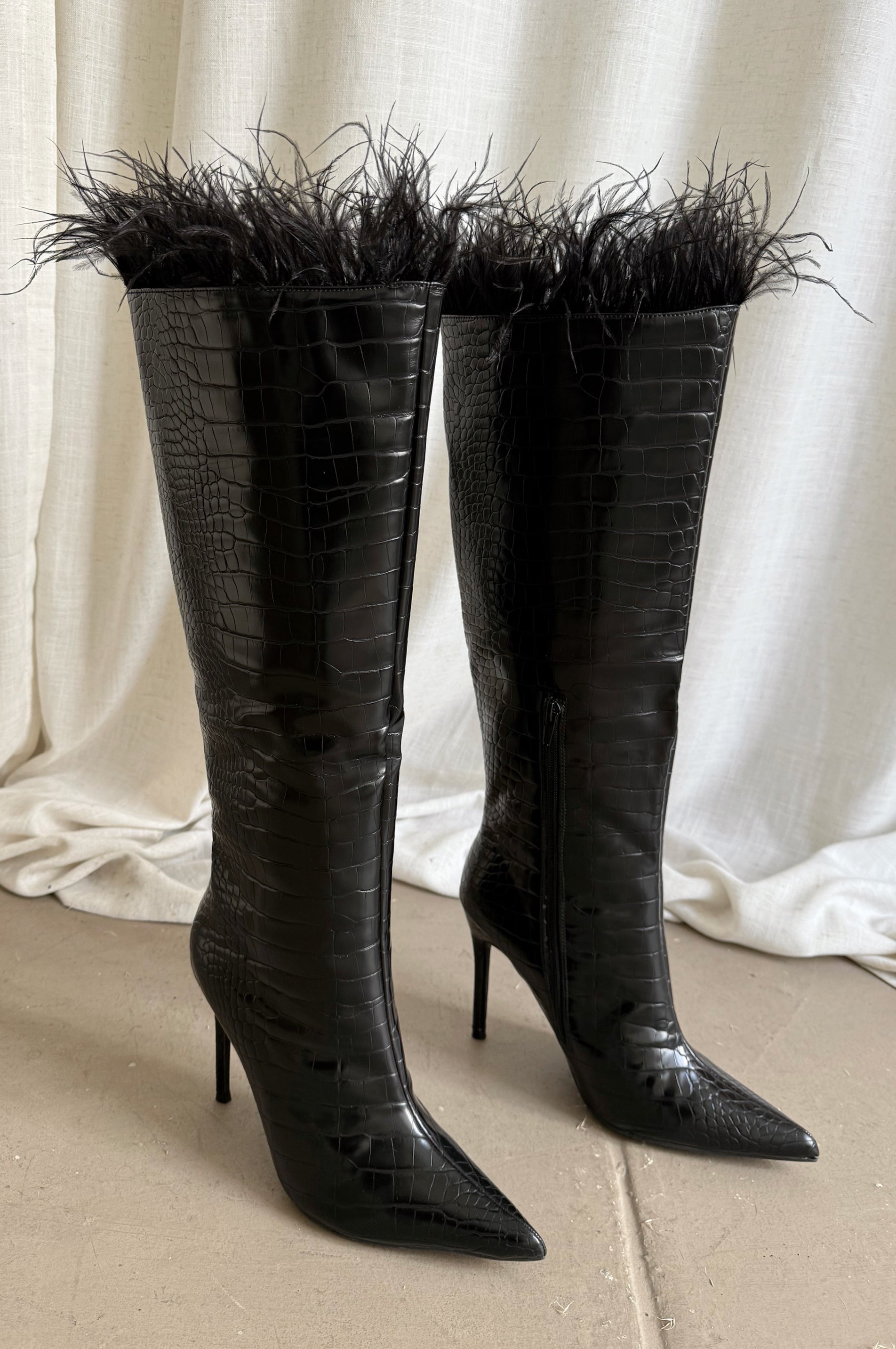 Make a bold entrance with these Feather Trim Croc Stiletto Boots. Featuring a glossy croc-embossed finish, dramatic feather trim, and a sleek pointed toe, these knee-high stilettos bring instant high-fashion drama to any look.